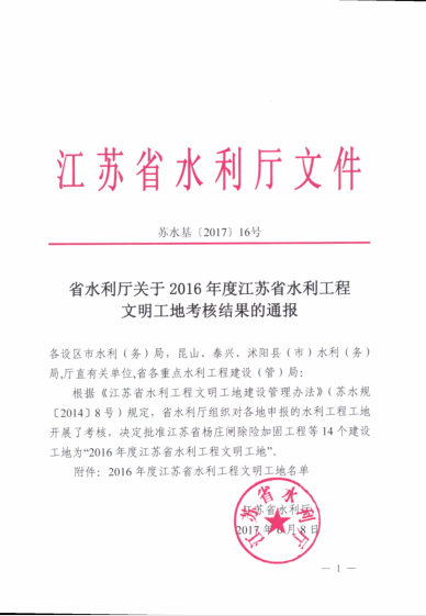 江蘇省水利工程文明工地 楊莊閘、小潮河